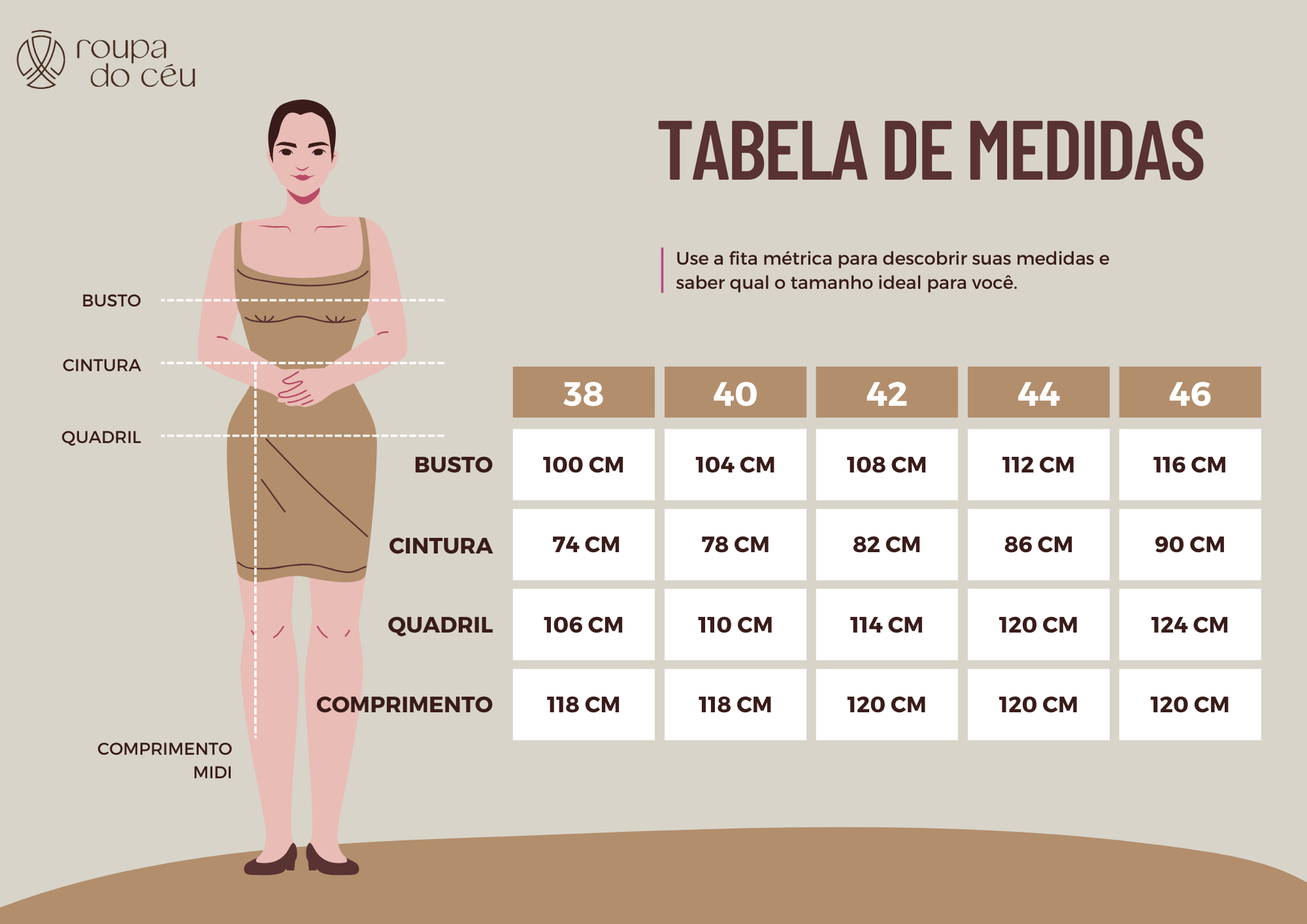 | Tamanho | Busto | Cintura | Quadril |